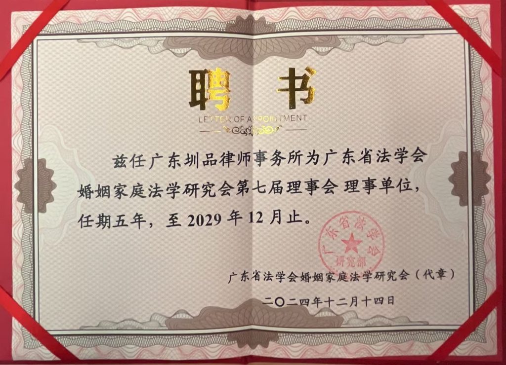 广东圳品律师事务所被选为理事单位,不仅是对其在婚姻家事、继承养老法律服务领域所做出努力的充分认可,更是对其在推动广东乃至全国继承养老、婚姻家事法学研究与实践进步中所贡献的智慧与力量的肯定。未来,圳品律所将继续秉承“专业、高效、优质、全面”的服务理念,致力于为客户提供更加卓越的法律服务。